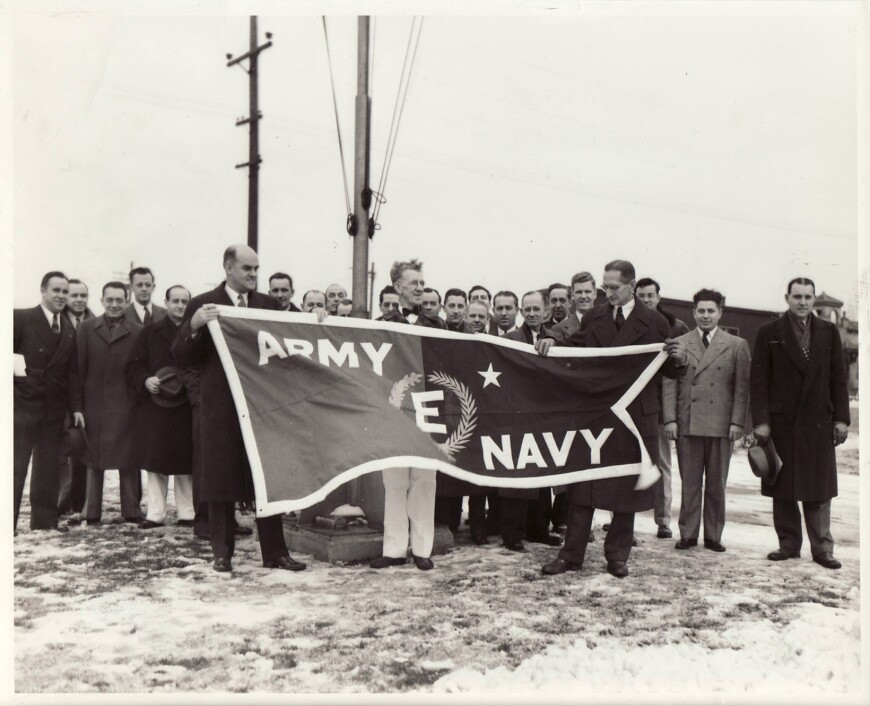 强生还生产了很多其他军用品,例如防毒面具、飞机零件和伪装材料等。凭借其卓越的贡献,强生被授予美国陆海军突出贡献奖。是少数获得该殊荣的供应商之一。上图是公司芝加哥地区的员工正在庆祝获得该殊荣。