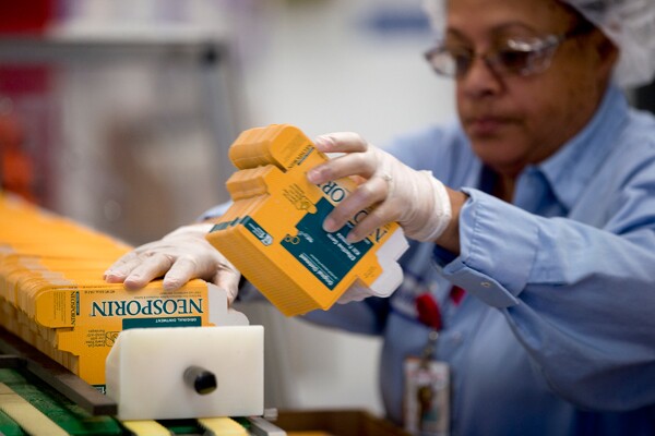 An employee stacks Johnson& Johnson Neosporin brand boxes on the production line at the J&J consumer healthcare products plant in Lititz, Pennsylvania, the United States. [Photo/Agencies]