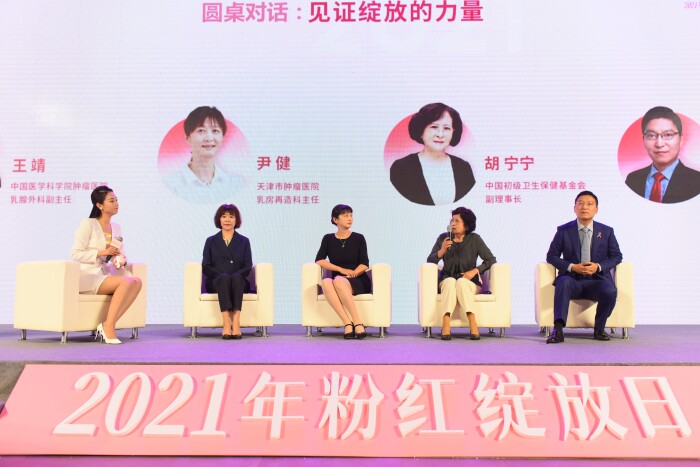 中国初级卫生保健基金会副理事长胡宁宁、天津市肿瘤医院乳房再造科主任尹健教授、中国医学科学院肿瘤医院乳腺外科副主任王靖教授、强生医疗心血管及专业解决方案事业部中国区总经理陈曦博士、宣传片导演黄骥、担任“2021年粉红绽放公益大使”的演员蒋勤勤等嘉宾出席本次发布活动。