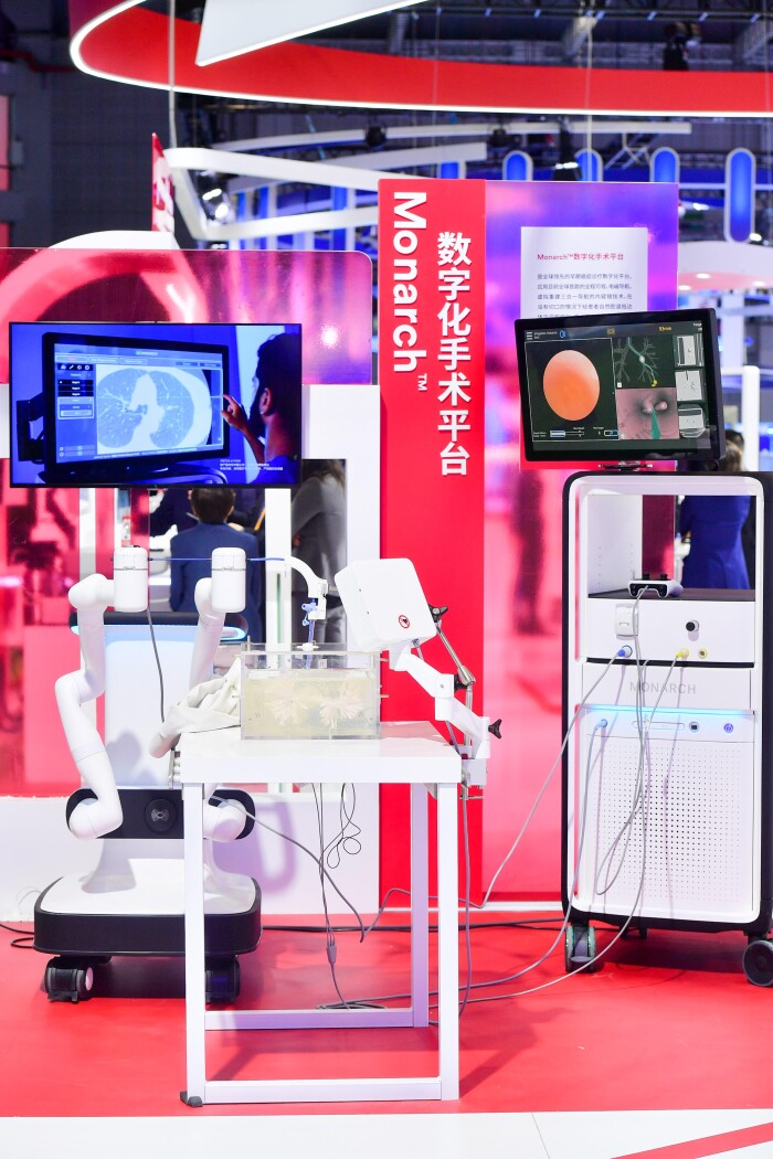医疗器材领域,强生推出了其今年最引人注目的黑科技数字化手术平台 -- MonarchTM。它是目前全球首台经支气管诊疗肺癌的数字化手术平台,应用了目前全球首个全程可视、电磁导航、虚拟重建三合一导航的内窥镜技术,术中视野全面清晰,在无切口的情况下,内窥镜可以经过支气管到达肺部深处外围的结节,提取组织以进行活检。此外,游戏手柄的操作精准灵活,显著缩短医生的学习曲线。MonarchTM对早期肺结节尤其是很多位置较深、难以触达的结节的诊断更微创和精准,更大限度地减少患者创伤、造福患者。本次进博会不仅是MonarchTM 的亚洲首秀,也是该数字化手术平台首次在美国以外的全球市场精彩亮相。