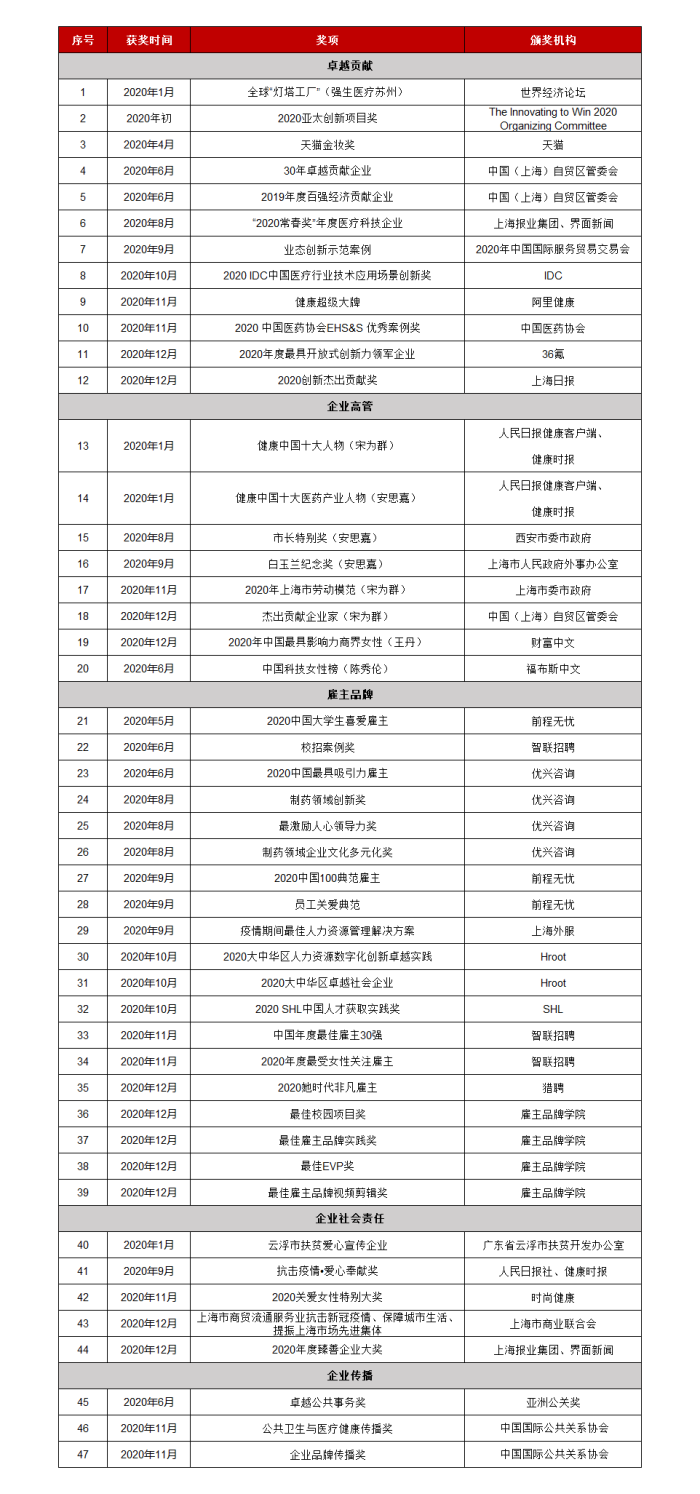 2020年,强生以创新与合作,全力推动中国医疗健康行业发展所做努力,获得各界广泛认可,斩获“2020创新杰出贡献奖”、“30年卓越贡献企业”、全球“灯塔工厂”、“卓越公共事务”等殊荣。与此同时,强生中国管理层多名高管和业务负责人以其在业务领域的积极贡献和卓越领导力荣获政府和主流媒体颁发的多项荣誉。其中,强生全球资深副总裁、中国区主席宋为群凭借多年来带领强生在中国市场的高质量发展,及其对行业发展的推动和支持,荣获“上海市劳动模范”、“中国(上海)自贸区三十年(1990-2020)杰出贡献企业家”、“健康中国十大人物”等荣誉称号。