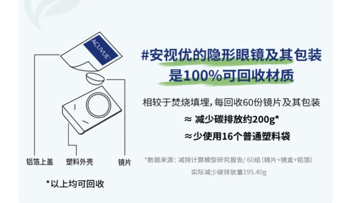 一直以来,安视优®都承诺用可持续的发展方式,来帮助创造一个值得去看的世界。与此同时,安视优®还希望能够将可持续发展的环保理念传递给每一位消费者,这也正是安视优®宣布发起“隐形超能力”环保项目的初衷,即通过呼吁大家参与隐形眼镜镜片与包装回收活动,促进回收材料重复利用,倡导循环经济。据统计,相较于焚烧填埋,回收60组(约为1个月的日抛用量)安视优®隐形眼镜镜片及其容器,就可减少195.4克的碳排放,相当于少使用16个塑料袋。